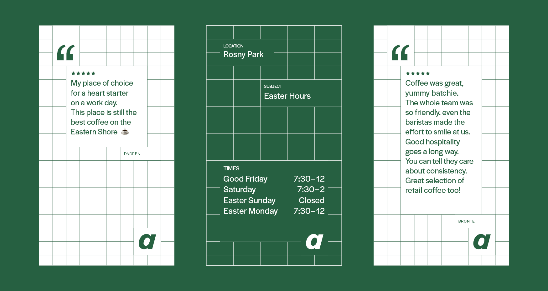 Brand applications for Audrey Coffee, who we’ve worked with since day one. Over the years, the identity has grown alongside the business, supporting its expansion from a single cafe to multiple locations. The consistent visual language pairs with high-quality product and service to build a loyal and ever-growing customer base.