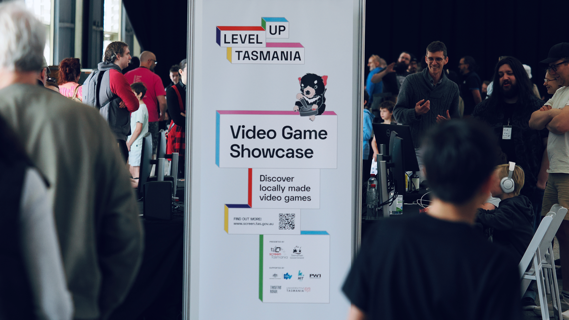 Brand identity for a Tasmanian Government initiative supporting the state’s growing video game industry through funding, events, and professional development. The look draws on classic gaming vernacular while staying approachable to a broader audience. A flexible holding shape system runs through the rollout, appearing across signage and event materials at the inaugural showcase to clearly frame information and keep visuals consistent.